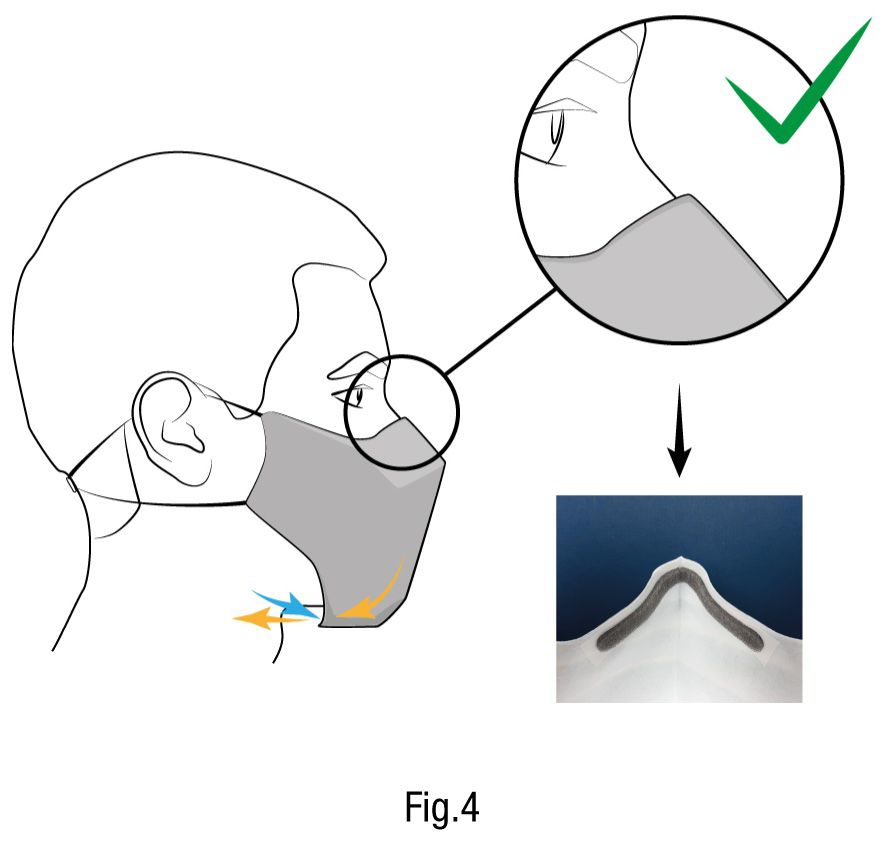 Put the mask on your face to cover your nose and chin (Fig. 1). Leave a space about the size of a finger between the mask and the underside of the chin for ventilation. The mask should be placed flat, halfway up on your nose (Fig. 4).